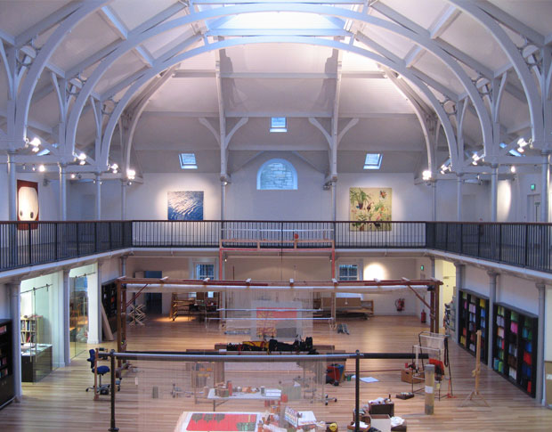 A disused Victorian swimming baths within the centre of Edinburgh has been converted into a mixed use development, including a workshop and gallery spaces for Dovecot Studios, Scotland's leading tapestry company. The tapestry workshop occupies the main pool space, with display on the gallery above and support spaces to the sides, screened by the vibrant yarn libraries which add a visual backdrop to the main volume. The exhibition spaces have been sited below the original pools, where natural light was not so critical. Office spaces are arranged within the ladies pool and, finally, residential flats wrap around and above the other uses. Externally the existing stone walls of the original building are retained, with new volumes added as simple zinc clad boxes maximising light, space and views.